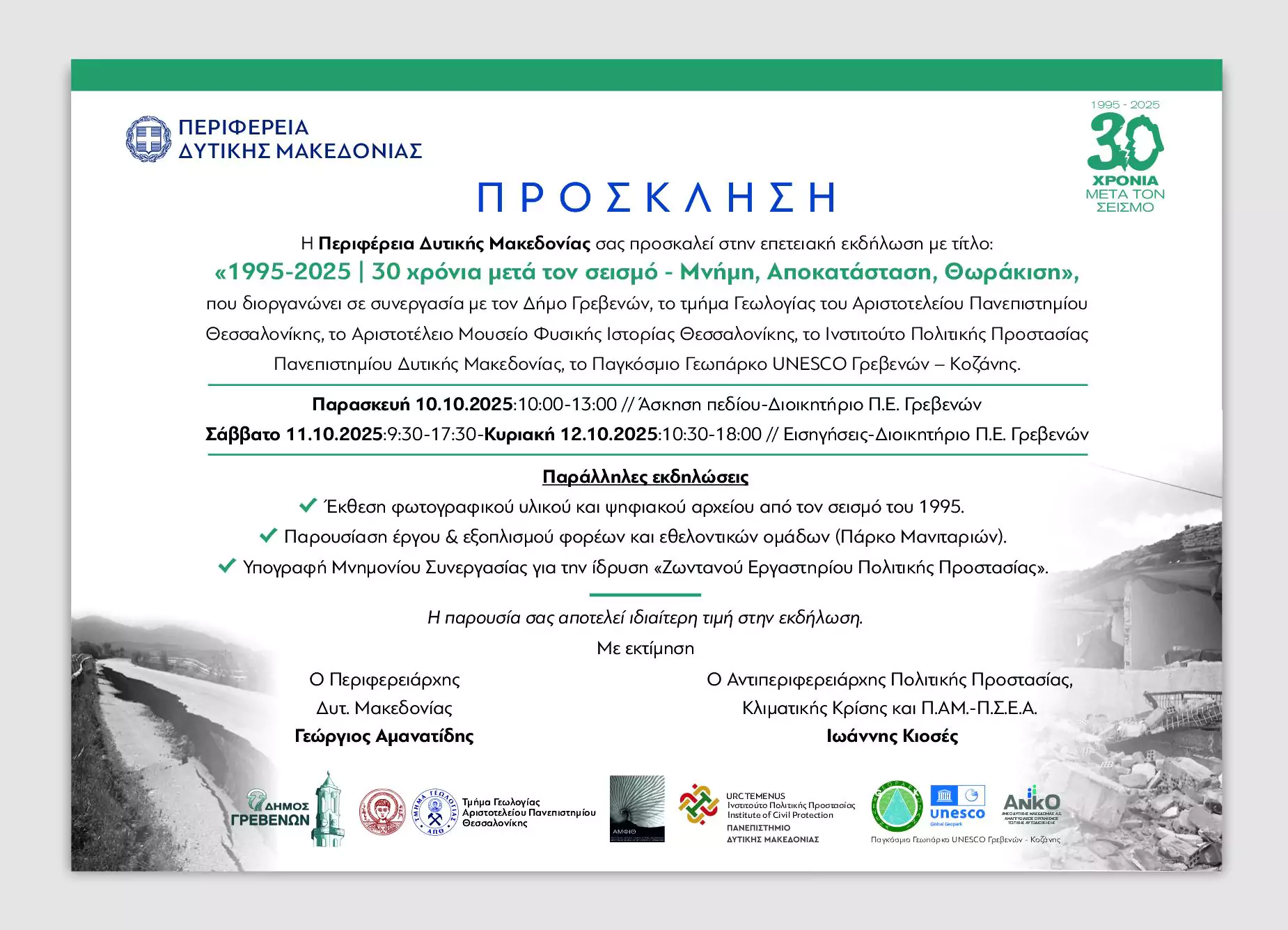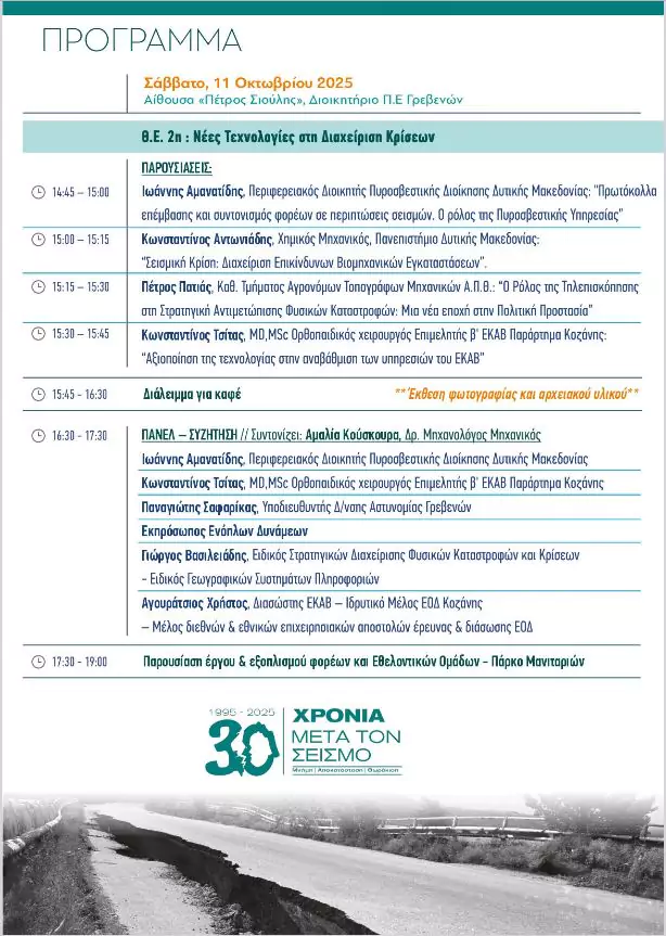 Επετειακή εκδήλωση: «1995 – 2025: 30 χρόνια μετά τον σεισμό -Μνήμη, Αποκατάσταση, Θωράκιση»