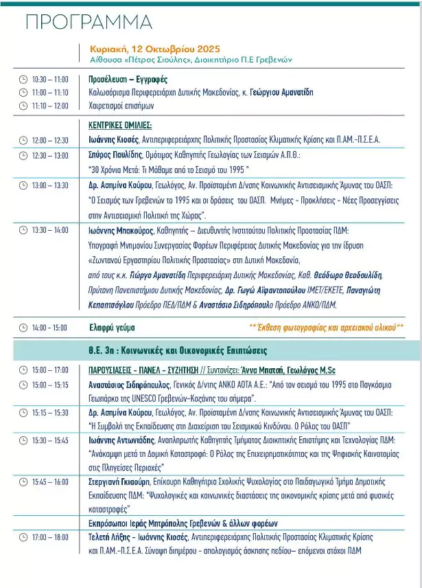 Το τριήμερο Παραασκευή 10, Σάββατο 11 και Κυριακή 12 Οκτωβρίου 2025 θα πραγματοποιηθεί επετειακή εκδήλωση με θέμα «1995 – 2025: 30 χρόνια μετά τον σεισμό -Μνήμη, Αποκατάσταση, Θωράκιση», με αφορμή τη συμπλήρωση 30 χρόνων από τον σεισμό του 1995.