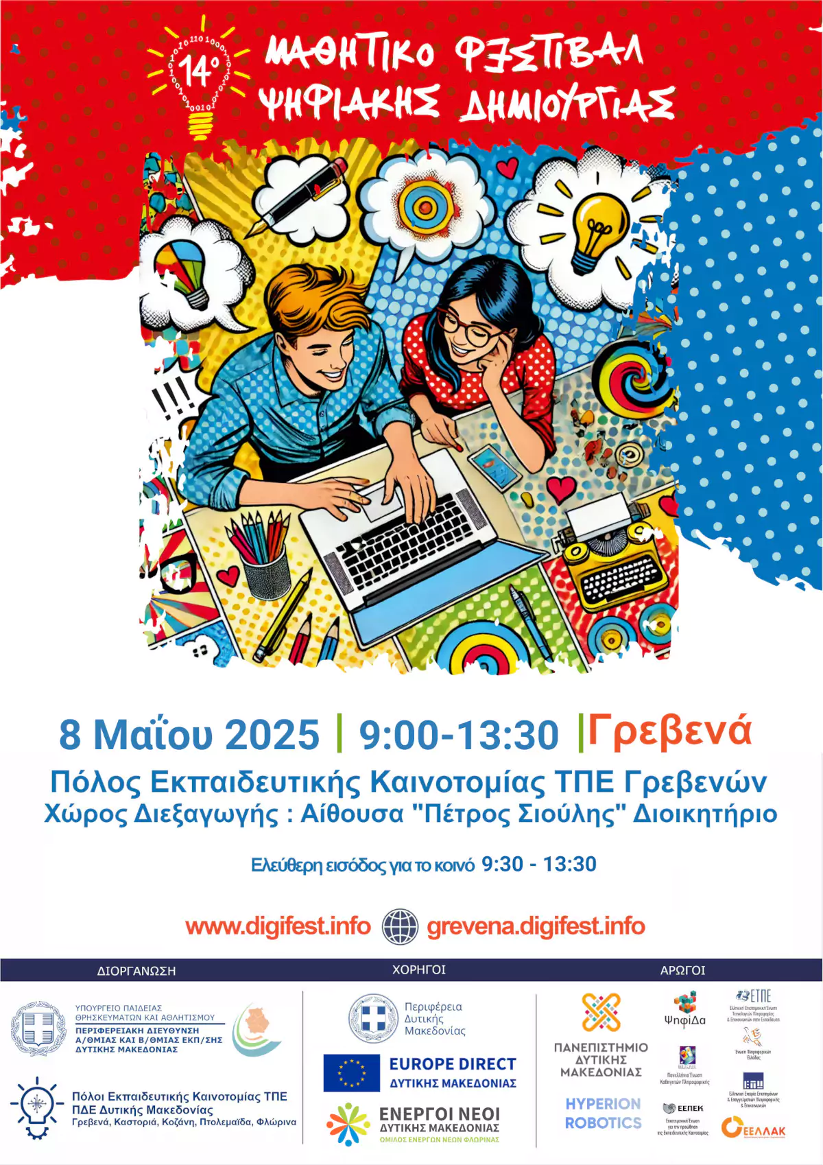 Το 14ο Μαθητικό Φεστιβάλ Ψηφιακής Δημιουργίας θα πραγματοποιηθεί με την υποστήριξη των Πόλων Εκπαιδευτικής Καινοτομίας Τ.Π.Ε. της Π.Δ.Ε. Δυτικής Μακεδονίας την Πέμπτη 08 Μαΐου 2025 σε Γρεβενά & Καστοριά και την Παρασκευή 09 Μαΐου 2025 σε Κοζάνη, Πτολεμαΐδα & Φλώρινα.