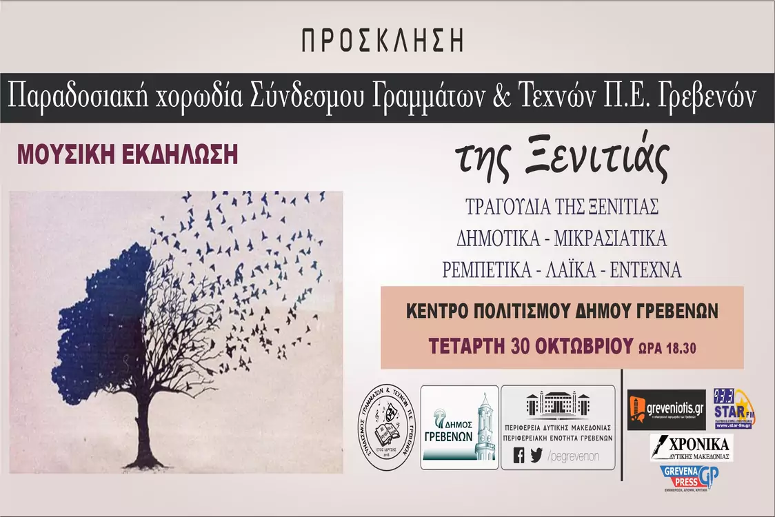 Ο Σύνδεσμος Γραμμάτων και Τεχνών Γρεβενών υπό την αιγίδα του Δήμου και της Περιφερειακής Ενότητας Γρεβενών διοργανώνει μουσική εκδήλωση αφιερωμένη στα τραγούδια της ξενιτιάς.