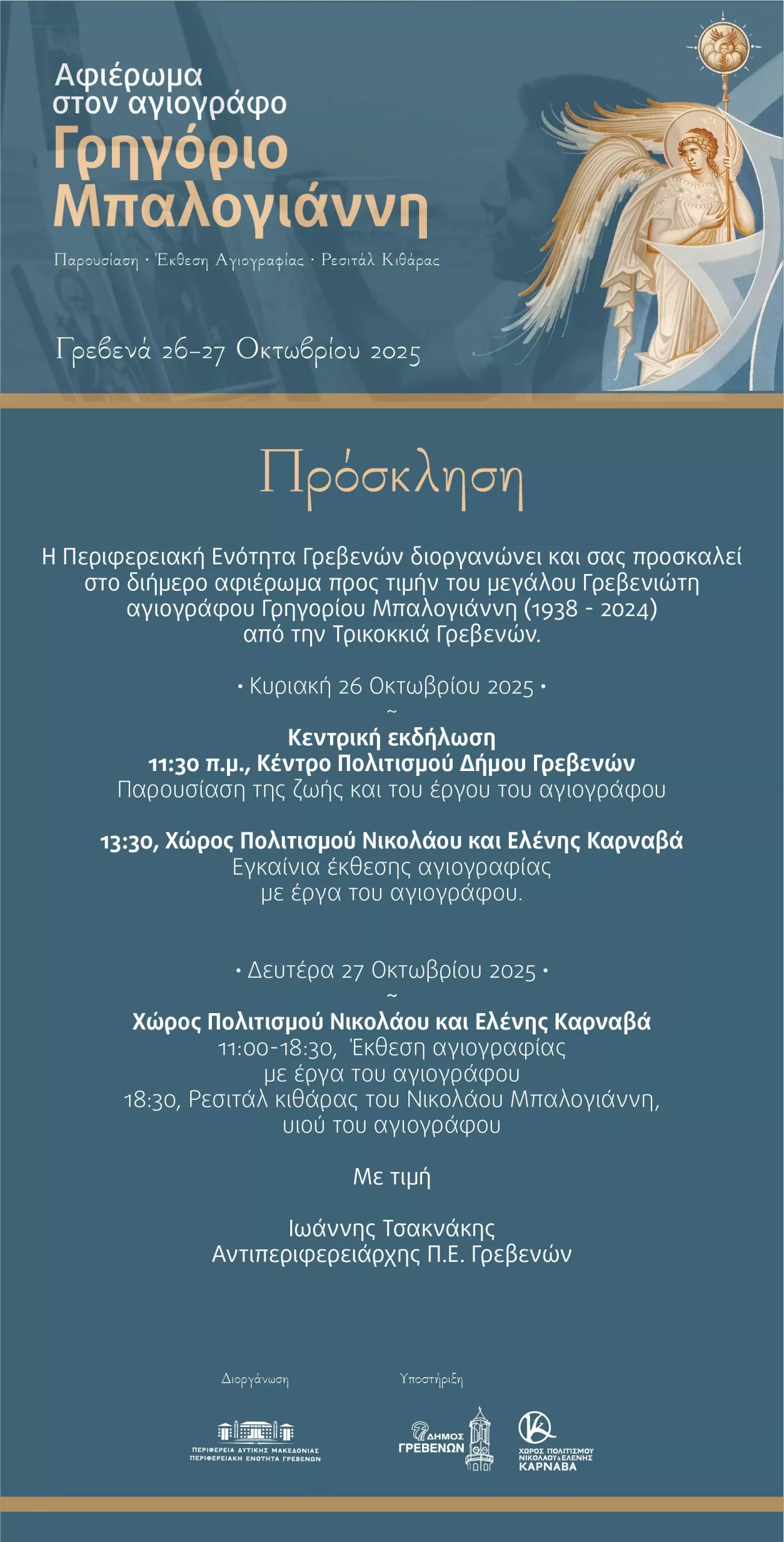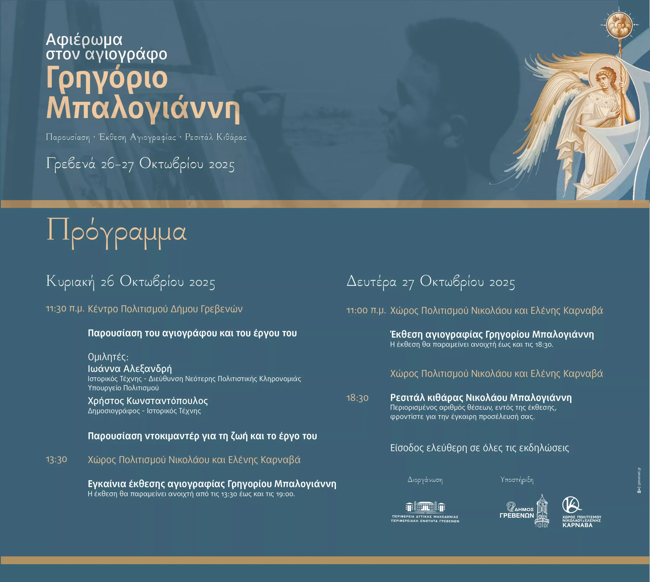 Η Περιφερειακή Ενότητα Γρεβενών διοργανώνει ένα διήμερο αφιέρωμα στον αγιογράφο Γρηγόριο Μπαλογιάννη και σας προσκαλεί να παρευρεθείτε για να γνωρίσετε έναν σπουδαίο Γρεβενιώτη, έναν ταλαντούχο και διακεκριμένο αγιογράφο.