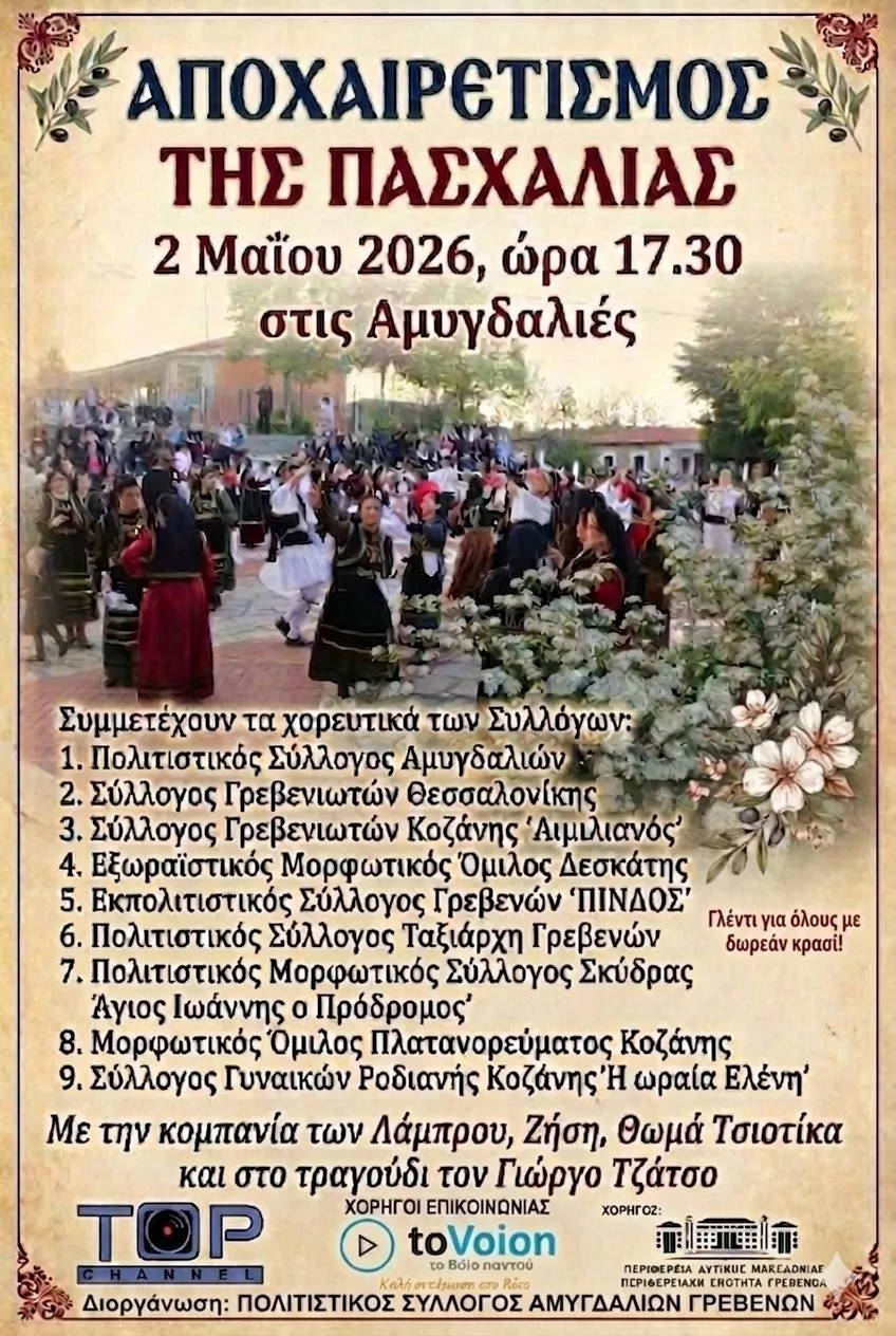 Ο Πολιτιστικός Σύλλογος Αμυγδαλιών Γρεβενών “Η Αμυγδαλιά” διοργανώνει και μας προσκαλεί στην ετήσια εκδήλωση για τον αποχαιρετισμό της Πασχαλιάς.