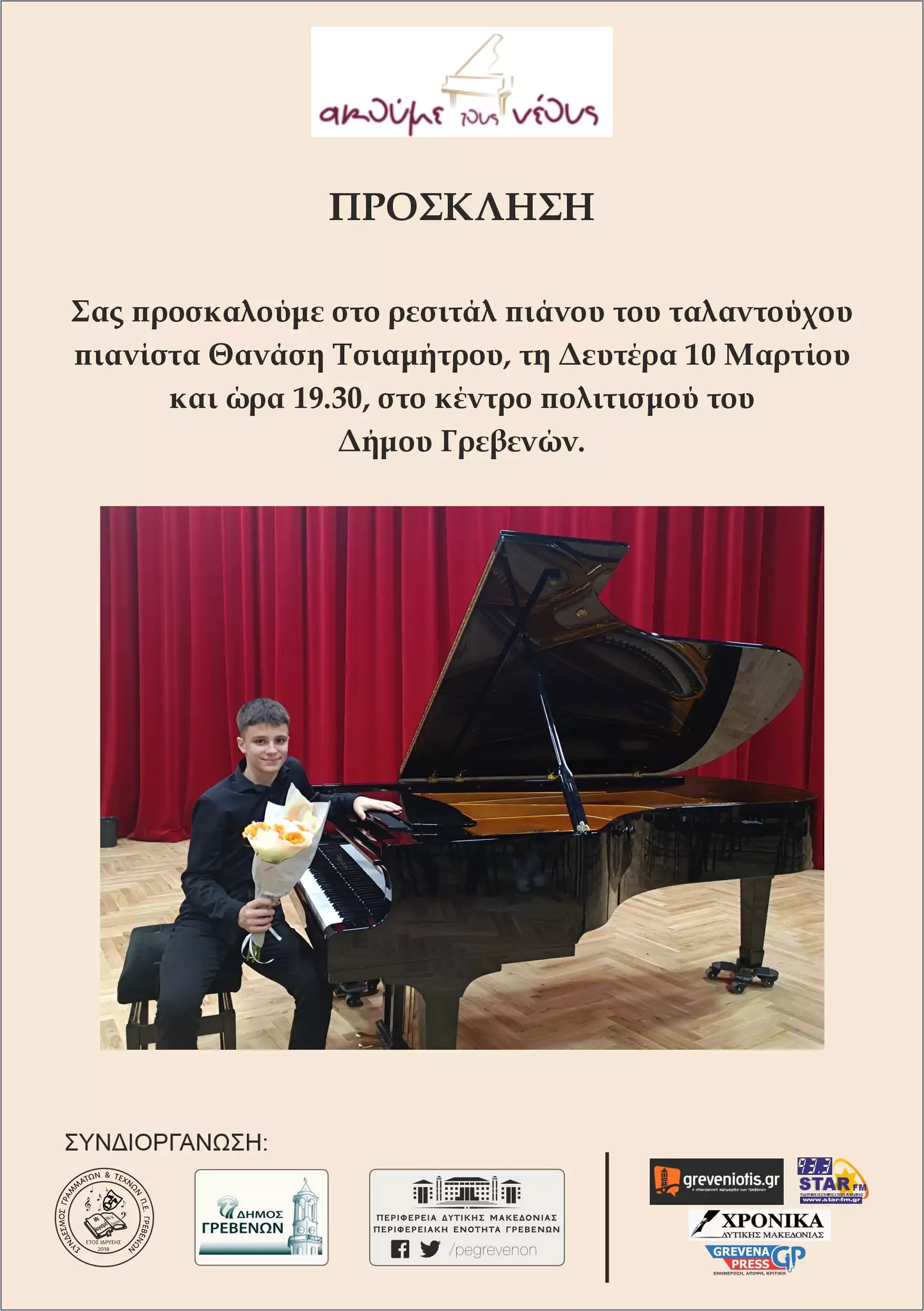 Τα Γρεβενά καλωσορίζουν την άνοιξη με το Ρεσιτάλ πιάνου του συντοπίτη μας και ταλαντούχου πιανίστα Θανάση Τσιαμήτρου, που θα πραγματοποιηθεί τη Δευτέρα 10 Μαρτίου, στις 19:30, στο Κέντρο Πολιτισμού του Δήμου Γρεβενών.
