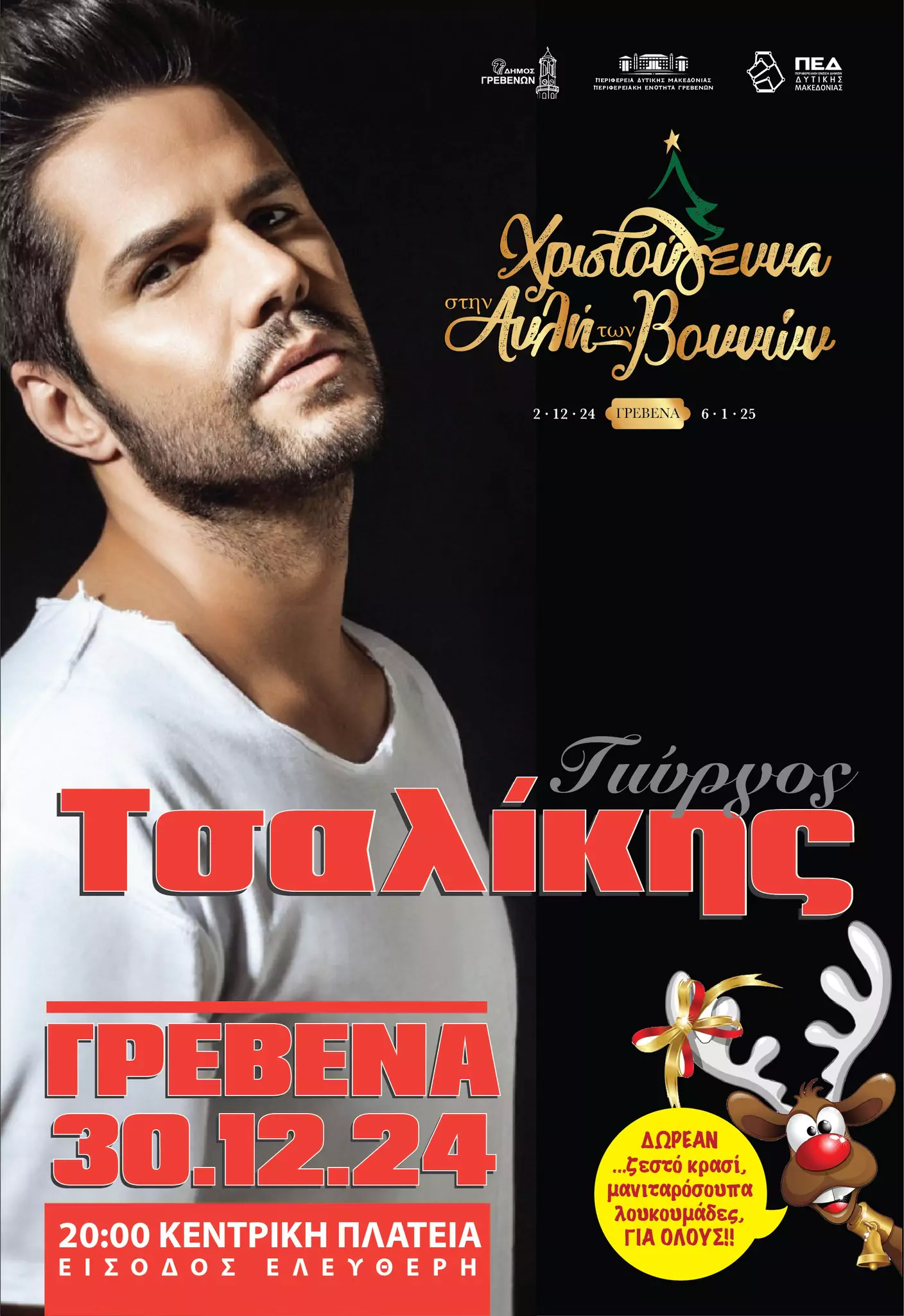 Στο πλαίσιο των Χριστουγεννιάτικων εκδηλώσεων Μαγικά Χριστούγεννα στην «ΑΥΛΗ ΤΩΝ ΒΟΥΝΩΝ», η Περιφερειακή Ενότητα Γρεβενών σε συνεργασία με το Δήμο Γρεβενών και το ΠΕΔ Δυτικής Μακεδονίας σας προσκαλούν στη μεγάλη συναυλία που θα πραγματοποιηθεί στο κέντρο της πόλης των Γρεβενών.