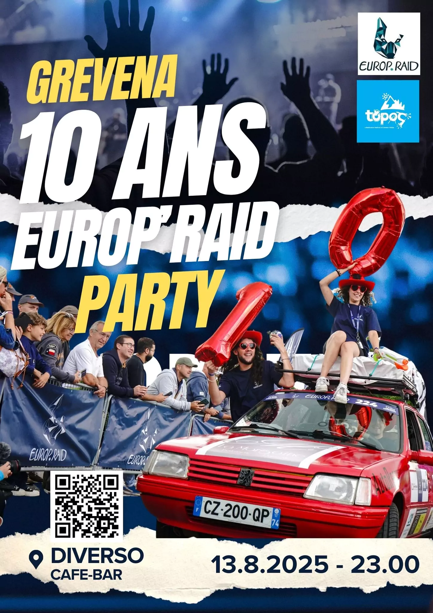 Στις 23:00 θα ακολουθήσει Anniversary Party της Europ’Raid για τη συμπλήρωση των 10 χρόνων διοργάνωσης με τους νέους από την Ευρώπη και τα Γρεβενά να γίνονται ένα στο Diverso Cafe-Bar στο κέντρο της πόλης.