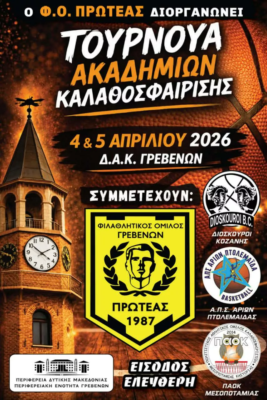 Ο Φ.Ο. Πρωτέας Γρεβενών διοργανώνει Τουρνουά Ακαδημιών Καλαθοσφαίρισης στις 4 και 5 Απριλίου 2026 στο Δ.Α.Κ. Γρεβενών
