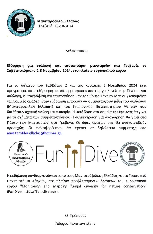 Η εκδήλωση πραγματοποιείται στο πλαίσιο προβλεπόμενων δράσεων του ευρωπαϊκού έργου “Monitoring and mapping fungal diversity for nature conservation” (FunDive) και αποτελεί συνδιοργάνωση των Μανιταρόφιλων Ελλάδας και του Γεωπονικού Πανεπιστημίου Αθηνών.