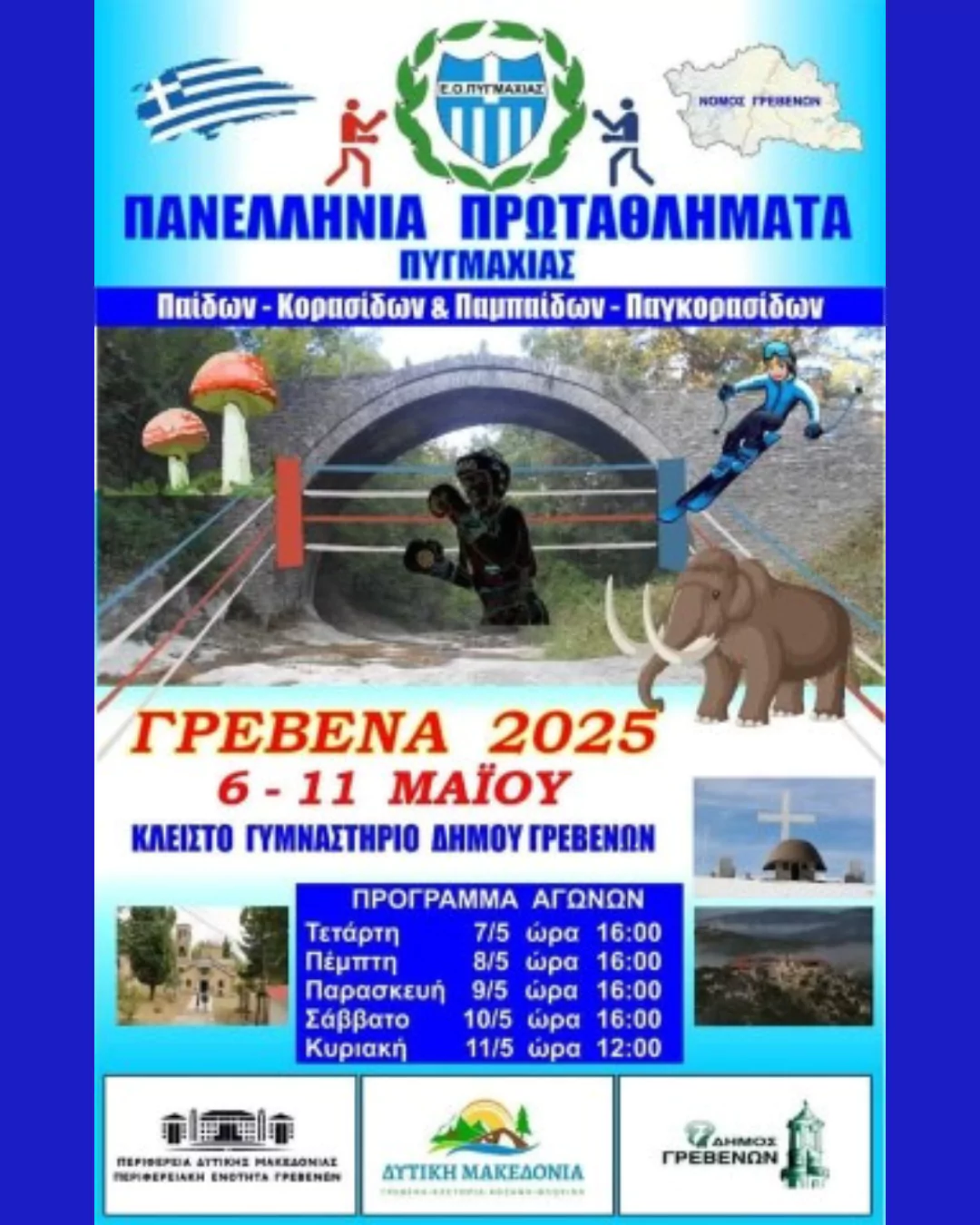 Η «καρδιά» της Ελληνικής πυγμαχίας θα χτυπήσει δυνατά στην πόλη των μανιταριών, καθώς από τις 6 έως τις 11 Μαΐου 2025 το Κλειστό Γυμναστήριο Δήμου Γρεβενών θα φιλοξενήσει τα Πανελλήνια Πρωταθλήματα Πυγμαχίας Παίδων – Κορασίδων & Παμπαίδων – Παγκορασίδων.