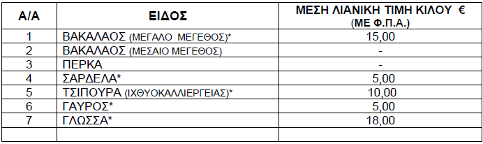 Οι διαμορφωθείσες μέσες λιανικές τιμές στα παρακάτω αναγραφόμενα είδη (ΝΩΠΑ ΨΑΡΙΑ) που προσφέρονται στις προμήθειες του Δημοσίου, Νοσηλευτικών Ιδρυμάτων και Ν.Π.Δ.Δ. χωροταξικής αρμοδιότητας της Π.Ε. Γρεβενών έχουν ως εξής: