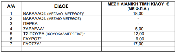 Οι διαμορφωθείσες μέσες λιανικές τιμές στα παρακάτω αναγραφόμενα είδη (ΝΩΠΑ ΨΑΡΙΑ) που προσφέρονται στις προμήθειες του Δημοσίου, Νοσηλευτικών Ιδρυμάτων και Ν.Π.Δ.Δ. χωροταξικής αρμοδιότητας της Π.Ε. Γρεβενών έχουν ως εξής: