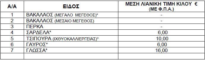 Οι διαμορφωθείσες μέσες λιανικές τιμές στα παρακάτω αναγραφόμενα είδη (ΝΩΠΑ ΨΑΡΙΑ) που προσφέρονται στις προμήθειες του Δημοσίου, Νοσηλευτικών Ιδρυμάτων και Ν.Π.Δ.Δ. χωροταξικής αρμοδιότητας της Π.Ε. Γρεβενών έχουν ως εξής: