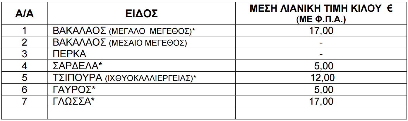 Οι διαμορφωθείσες μέσες λιανικές τιμές στα παρακάτω αναγραφόμενα είδη (ΝΩΠΑ ΨΑΡΙΑ) που προσφέρονται στις προμήθειες του Δημοσίου, Νοσηλευτικών Ιδρυμάτων και Ν.Π.Δ.Δ. χωροταξικής αρμοδιότητας της Π.Ε. Γρεβενών έχουν ως εξής: