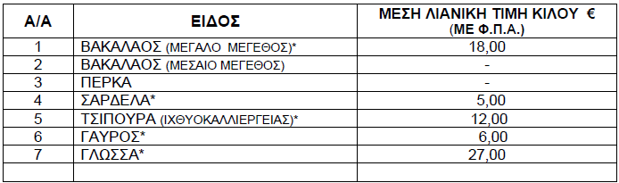 Οι διαμορφωθείσες μέσες λιανικές τιμές στα παρακάτω αναγραφόμενα είδη (ΝΩΠΑ ΨΑΡΙΑ) που προσφέρονται στις προμήθειες του Δημοσίου, Νοσηλευτικών Ιδρυμάτων και Ν.Π.Δ.Δ. χωροταξικής αρμοδιότητας της Π.Ε. Γρεβενών έχουν ως εξής: