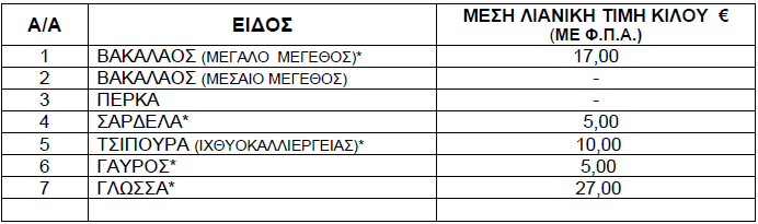 Οι διαμορφωθείσες μέσες λιανικές τιμές στα παρακάτω αναγραφόμενα είδη (ΝΩΠΑ ΨΑΡΙΑ) που προσφέρονται στις προμήθειες του Δημοσίου, Νοσηλευτικών Ιδρυμάτων και Ν.Π.Δ.Δ. χωροταξικής αρμοδιότητας της Π.Ε. Γρεβενών έχουν ως εξής: