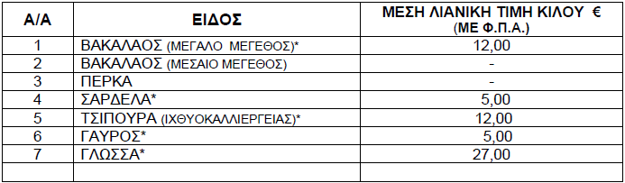Οι διαμορφωθείσες μέσες λιανικές τιμές στα παρακάτω αναγραφόμενα είδη (ΝΩΠΑ ΨΑΡΙΑ) που προσφέρονται στις προμήθειες του Δημοσίου, Νοσηλευτικών Ιδρυμάτων και Ν.Π.Δ.Δ. χωροταξικής αρμοδιότητας της Π.Ε. Γρεβενών έχουν ως εξής: