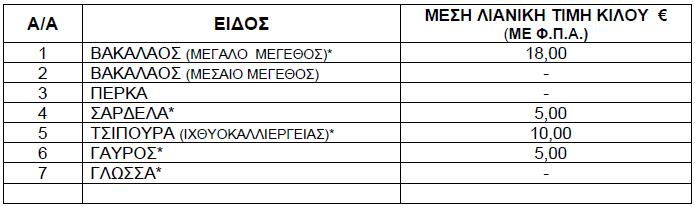 Οι διαμορφωθείσες μέσες λιανικές τιμές στα παρακάτω αναγραφόμενα είδη (ΝΩΠΑ ΨΑΡΙΑ) που προσφέρονται στις προμήθειες του Δημοσίου, Νοσηλευτικών Ιδρυμάτων και Ν.Π.Δ.Δ. χωροταξικής αρμοδιότητας της Π.Ε. Γρεβενών έχουν ως εξής: