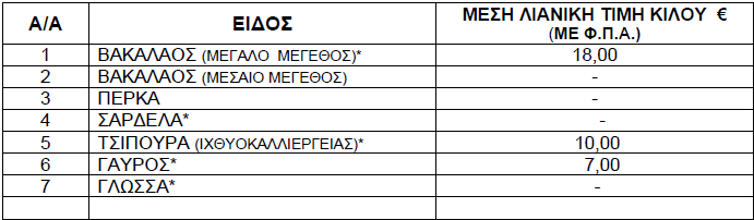 Οι διαμορφωθείσες μέσες λιανικές τιμές στα παρακάτω αναγραφόμενα είδη (ΝΩΠΑ ΨΑΡΙΑ) που προσφέρονται στις προμήθειες του Δημοσίου, Νοσηλευτικών Ιδρυμάτων και Ν.Π.Δ.Δ. χωροταξικής αρμοδιότητας της Π.Ε. Γρεβενών έχουν ως εξής: