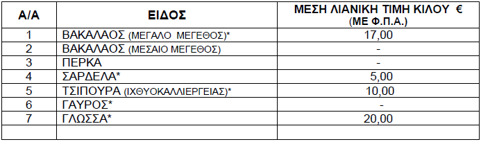 Οι διαμορφωθείσες μέσες λιανικές τιμές στα παρακάτω αναγραφόμενα είδη (ΝΩΠΑ ΨΑΡΙΑ) που προσφέρονται στις προμήθειες του Δημοσίου, Νοσηλευτικών Ιδρυμάτων και Ν.Π.Δ.Δ. χωροταξικής αρμοδιότητας της Π.Ε. Γρεβενών έχουν ως εξής: