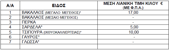 Οι διαμορφωθείσες μέσες λιανικές τιμές στα παρακάτω αναγραφόμενα είδη (ΝΩΠΑ ΨΑΡΙΑ) που προσφέρονται στις προμήθειες του Δημοσίου, Νοσηλευτικών Ιδρυμάτων και Ν.Π.Δ.Δ. χωροταξικής αρμοδιότητας της Π.Ε. Γρεβενών έχουν ως εξής: