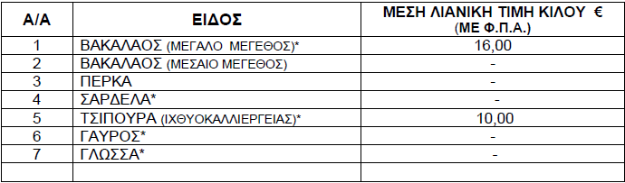 Οι διαμορφωθείσες μέσες λιανικές τιμές στα παρακάτω αναγραφόμενα είδη (ΝΩΠΑ ΨΑΡΙΑ) που προσφέρονται στις προμήθειες του Δημοσίου, Νοσηλευτικών Ιδρυμάτων και Ν.Π.Δ.Δ. χωροταξικής αρμοδιότητας της Π.Ε. Γρεβενών έχουν ως εξής: