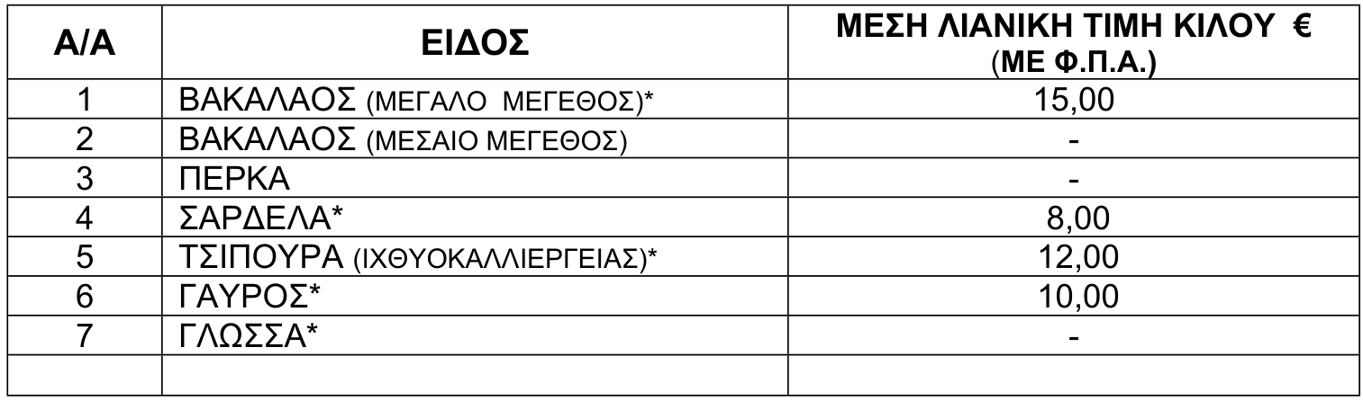 Οι διαμορφωθείσες μέσες λιανικές τιμές στα παρακάτω αναγραφόμενα είδη (ΝΩΠΑ ΨΑΡΙΑ) που προσφέρονται στις προμήθειες του Δημοσίου, Νοσηλευτικών Ιδρυμάτων και Ν.Π.Δ.Δ. χωροταξικής αρμοδιότητας της Π.Ε. Γρεβενών έχουν ως εξής: