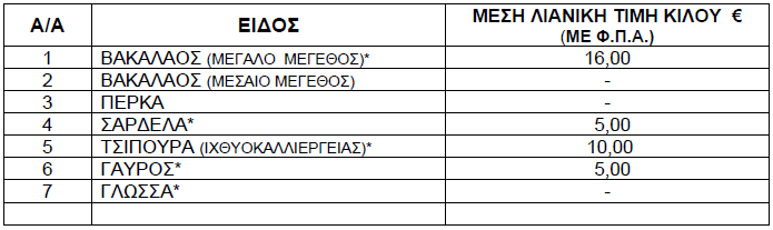 Οι διαμορφωθείσες μέσες λιανικές τιμές στα παρακάτω αναγραφόμενα είδη (ΝΩΠΑ ΨΑΡΙΑ) που προσφέρονται στις προμήθειες του Δημοσίου, Νοσηλευτικών Ιδρυμάτων και Ν.Π.Δ.Δ. χωροταξικής αρμοδιότητας της Π.Ε. Γρεβενών έχουν ως εξής: