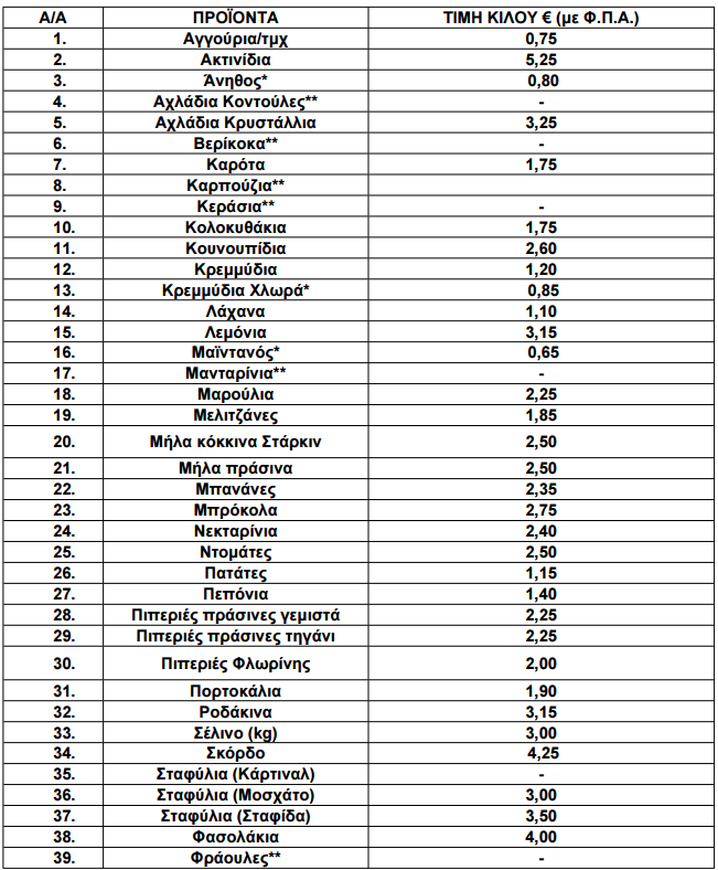 Οι διαμορφωθείσες μέσες λιανικές τιμές στα παρακάτω αναγραφόμενα είδη (ΟΠΩΡΟΚΗΠΕΥΤΙΚΑ) που προσφέρονται στις προμήθειες του Δημοσίου, Νοσηλευτικών Ιδρυμάτων και Ν.Π.Δ.Δ. χωροταξικής αρμοδιότητας της Π.Ε. Γρεβενών έχουν ως εξής: