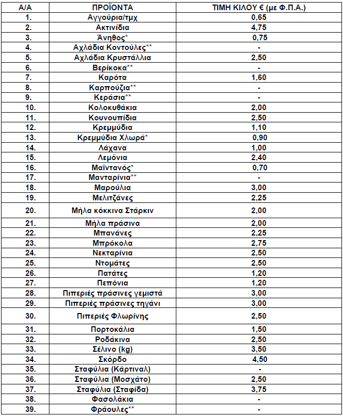 Οι διαμορφωθείσες μέσες λιανικές τιμές στα παρακάτω αναγραφόμενα είδη (ΟΠΩΡΟΚΗΠΕΥΤΙΚΑ) που προσφέρονται στις προμήθειες του Δημοσίου, Νοσηλευτικών Ιδρυμάτων και Ν.Π.Δ.Δ. χωροταξικής αρμοδιότητας της Π.Ε. Γρεβενών έχουν ως εξής: