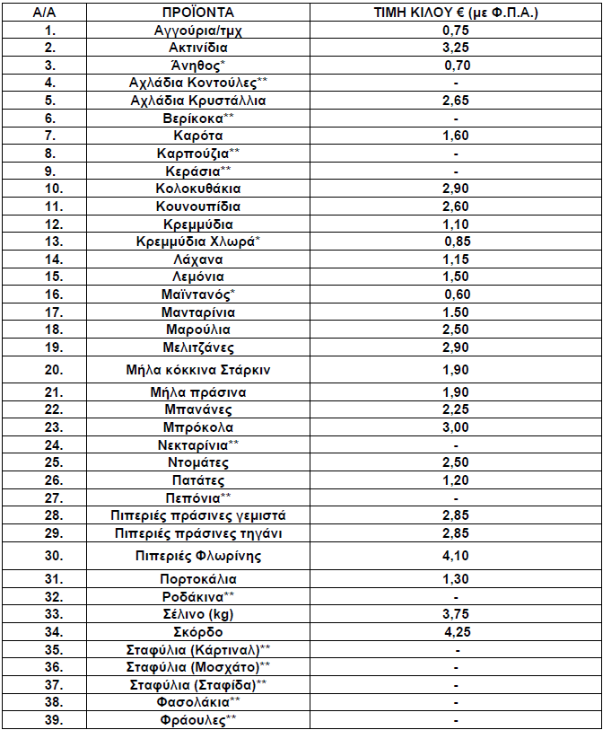 Οι διαμορφωθείσες μέσες λιανικές τιμές στα παρακάτω αναγραφόμενα είδη (ΟΠΩΡΟΚΗΠΕΥΤΙΚΑ) που προσφέρονται στις προμήθειες του Δημοσίου, Νοσηλευτικών Ιδρυμάτων και Ν.Π.Δ.Δ. χωροταξικής αρμοδιότητας της Π.Ε. Γρεβενών έχουν ως εξής: