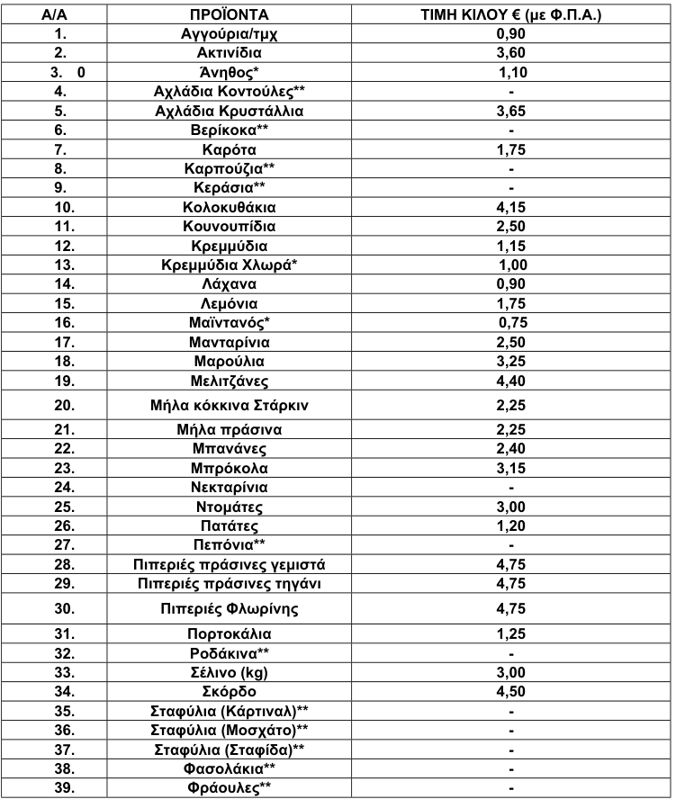 Οι διαμορφωθείσες μέσες λιανικές τιμές στα παρακάτω αναγραφόμενα είδη (ΟΠΩΡΟΚΗΠΕΥΤΙΚΑ) που προσφέρονται στις προμήθειες του Δημοσίου, Νοσηλευτικών Ιδρυμάτων και Ν.Π.Δ.Δ. χωροταξικής αρμοδιότητας της Π.Ε. Γρεβενών έχουν ως εξής: