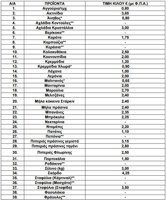 Οι διαμορφωθείσες μέσες λιανικές τιμές στα παρακάτω αναγραφόμενα είδη (ΟΠΩΡΟΚΗΠΕΥΤΙΚΑ) που προσφέρονται στις προμήθειες του Δημοσίου, Νοσηλευτικών Ιδρυμάτων και Ν.Π.Δ.Δ. χωροταξικής αρμοδιότητας της Π.Ε. Γρεβενών έχουν ως εξής:
