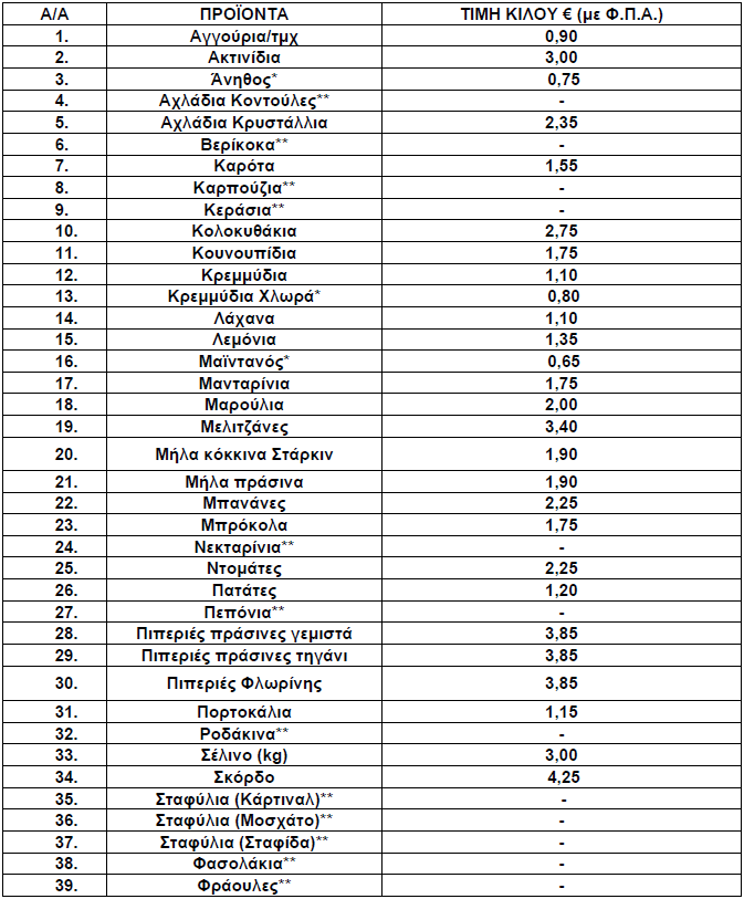 Οι διαμορφωθείσες μέσες λιανικές τιμές στα παρακάτω αναγραφόμενα είδη (ΟΠΩΡΟΚΗΠΕΥΤΙΚΑ) που προσφέρονται στις προμήθειες του Δημοσίου, Νοσηλευτικών Ιδρυμάτων και Ν.Π.Δ.Δ. χωροταξικής αρμοδιότητας της Π.Ε. Γρεβενών έχουν ως εξής: