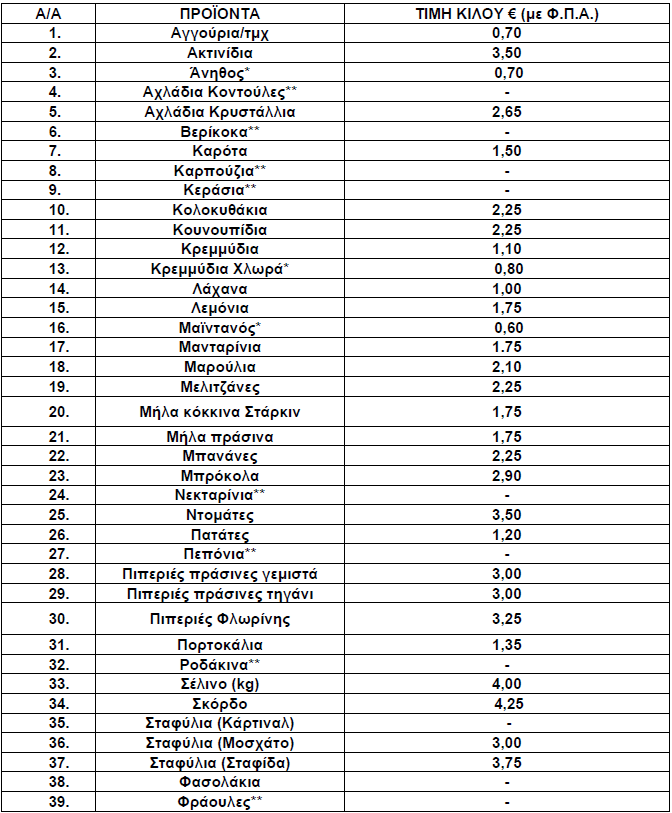 Οι διαμορφωθείσες μέσες λιανικές τιμές στα παρακάτω αναγραφόμενα είδη (ΟΠΩΡΟΚΗΠΕΥΤΙΚΑ) που προσφέρονται στις προμήθειες του Δημοσίου, Νοσηλευτικών Ιδρυμάτων και Ν.Π.Δ.Δ. χωροταξικής αρμοδιότητας της Π.Ε. Γρεβενών έχουν ως εξής: