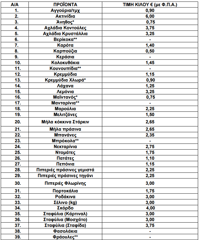 Οι διαμορφωθείσες μέσες λιανικές τιμές στα παρακάτω αναγραφόμενα είδη (ΟΠΩΡΟΚΗΠΕΥΤΙΚΑ) που προσφέρονται στις προμήθειες του Δημοσίου, Νοσηλευτικών Ιδρυμάτων και Ν.Π.Δ.Δ. χωροταξικής αρμοδιότητας της Π.Ε. Γρεβενών έχουν ως εξής: