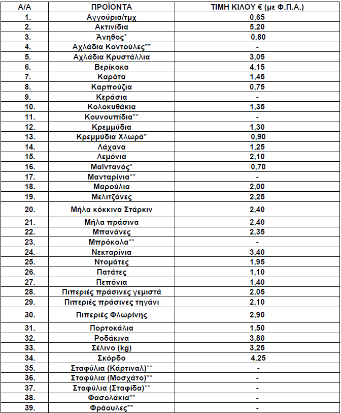 Οι διαμορφωθείσες μέσες λιανικές τιμές στα παρακάτω αναγραφόμενα είδη (ΟΠΩΡΟΚΗΠΕΥΤΙΚΑ) που προσφέρονται στις προμήθειες του Δημοσίου, Νοσηλευτικών Ιδρυμάτων και Ν.Π.Δ.Δ. χωροταξικής αρμοδιότητας της Π.Ε. Γρεβενών έχουν ως εξής: