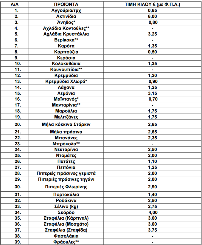 Οι διαμορφωθείσες μέσες λιανικές τιμές στα παρακάτω αναγραφόμενα είδη (ΟΠΩΡΟΚΗΠΕΥΤΙΚΑ) που προσφέρονται στις προμήθειες του Δημοσίου, Νοσηλευτικών Ιδρυμάτων και Ν.Π.Δ.Δ. χωροταξικής αρμοδιότητας της Π.Ε. Γρεβενών έχουν ως εξής: