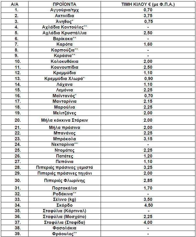 Οι διαμορφωθείσες μέσες λιανικές τιμές στα παρακάτω αναγραφόμενα είδη (ΟΠΩΡΟΚΗΠΕΥΤΙΚΑ) που προσφέρονται στις προμήθειες του Δημοσίου, Νοσηλευτικών Ιδρυμάτων και Ν.Π.Δ.Δ. χωροταξικής αρμοδιότητας της Π.Ε. Γρεβενών έχουν ως εξής:
