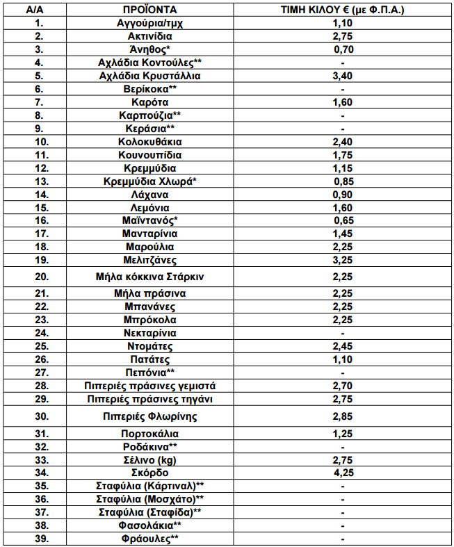 Οι διαμορφωθείσες μέσες λιανικές τιμές στα παρακάτω αναγραφόμενα είδη (ΟΠΩΡΟΚΗΠΕΥΤΙΚΑ) που προσφέρονται στις προμήθειες του Δημοσίου, Νοσηλευτικών Ιδρυμάτων και Ν.Π.Δ.Δ. χωροταξικής αρμοδιότητας της Π.Ε. Γρεβενών έχουν ως εξής: