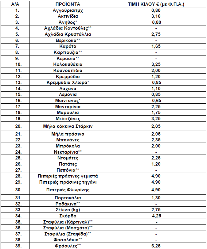 Οι διαμορφωθείσες μέσες λιανικές τιμές στα παρακάτω αναγραφόμενα είδη (ΟΠΩΡΟΚΗΠΕΥΤΙΚΑ) που προσφέρονται στις προμήθειες του Δημοσίου, Νοσηλευτικών Ιδρυμάτων και Ν.Π.Δ.Δ. χωροταξικής αρμοδιότητας της Π.Ε. Γρεβενών έχουν ως εξής: