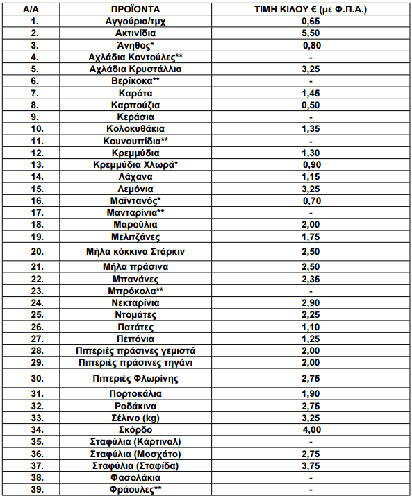 Οι διαμορφωθείσες μέσες λιανικές τιμές στα παρακάτω αναγραφόμενα είδη (ΟΠΩΡΟΚΗΠΕΥΤΙΚΑ) που προσφέρονται στις προμήθειες του Δημοσίου, Νοσηλευτικών Ιδρυμάτων και Ν.Π.Δ.Δ. χωροταξικής αρμοδιότητας της Π.Ε. Γρεβενών έχουν ως εξής: