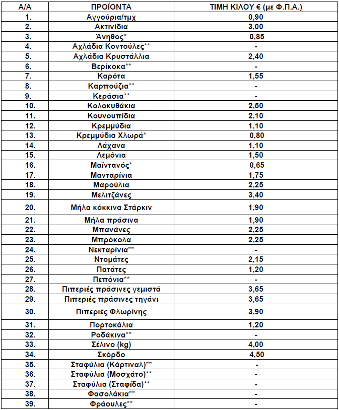 Οι διαμορφωθείσες μέσες λιανικές τιμές στα παρακάτω αναγραφόμενα είδη (ΟΠΩΡΟΚΗΠΕΥΤΙΚΑ) που προσφέρονται στις προμήθειες του Δημοσίου, Νοσηλευτικών Ιδρυμάτων και Ν.Π.Δ.Δ. χωροταξικής αρμοδιότητας της Π.Ε. Γρεβενών έχουν ως εξής: