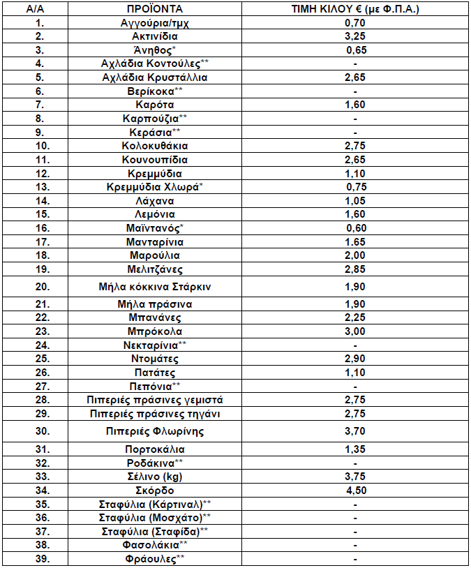 Οι διαμορφωθείσες μέσες λιανικές τιμές στα παρακάτω αναγραφόμενα είδη (ΟΠΩΡΟΚΗΠΕΥΤΙΚΑ) που προσφέρονται στις προμήθειες του Δημοσίου, Νοσηλευτικών Ιδρυμάτων και Ν.Π.Δ.Δ. χωροταξικής αρμοδιότητας της Π.Ε. Γρεβενών έχουν ως εξής: