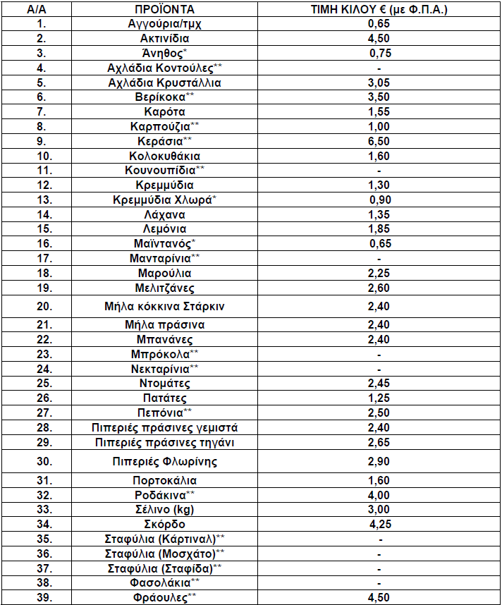 Οι διαμορφωθείσες μέσες λιανικές τιμές στα παρακάτω αναγραφόμενα είδη (ΟΠΩΡΟΚΗΠΕΥΤΙΚΑ) που προσφέρονται στις προμήθειες του Δημοσίου, Νοσηλευτικών Ιδρυμάτων και Ν.Π.Δ.Δ. χωροταξικής αρμοδιότητας της Π.Ε. Γρεβενών έχουν ως εξής: