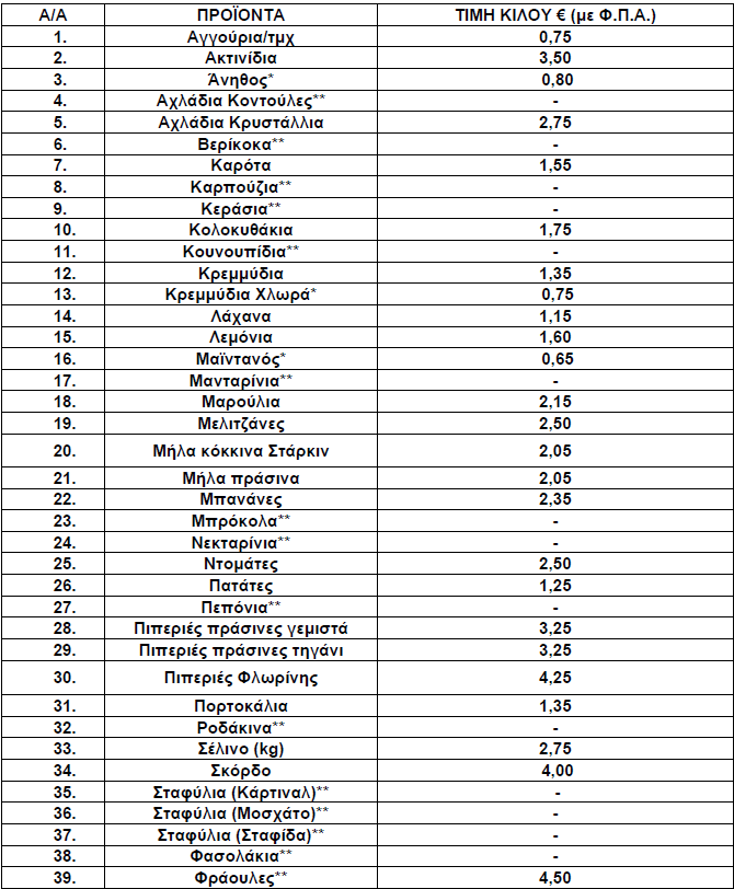 Οι διαμορφωθείσες μέσες λιανικές τιμές στα παρακάτω αναγραφόμενα είδη (ΟΠΩΡΟΚΗΠΕΥΤΙΚΑ) που προσφέρονται στις προμήθειες του Δημοσίου, Νοσηλευτικών Ιδρυμάτων και Ν.Π.Δ.Δ. χωροταξικής αρμοδιότητας της Π.Ε. Γρεβενών έχουν ως εξής: