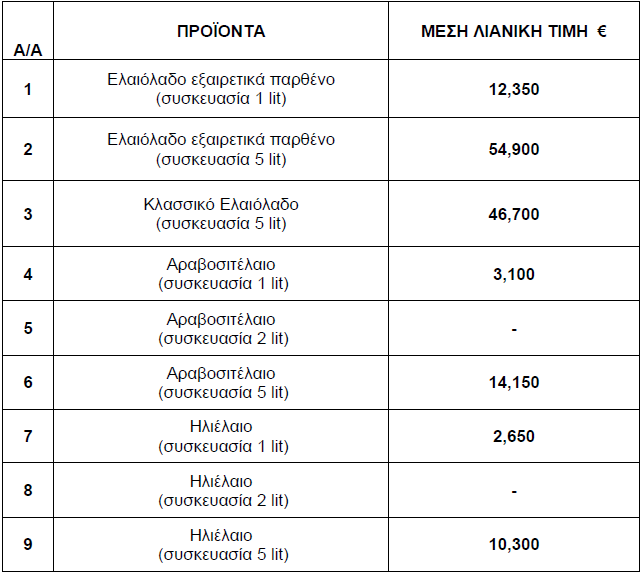 Πώς κυμάνθηκαν οι τιμές ελαιόλαδου, αραβοσιτελαίου και ηλιέλαιου τον Ιανουάριο του 2025, σύμφωνα με τις τιμοληψίες του Τμήματος Εμπορίου της Διεύθυνσης Βιομηχανίας, Εμπορίου, Παιδείας και Απασχόλησης της Περιφερειακής Ενότητας Γρεβενών.