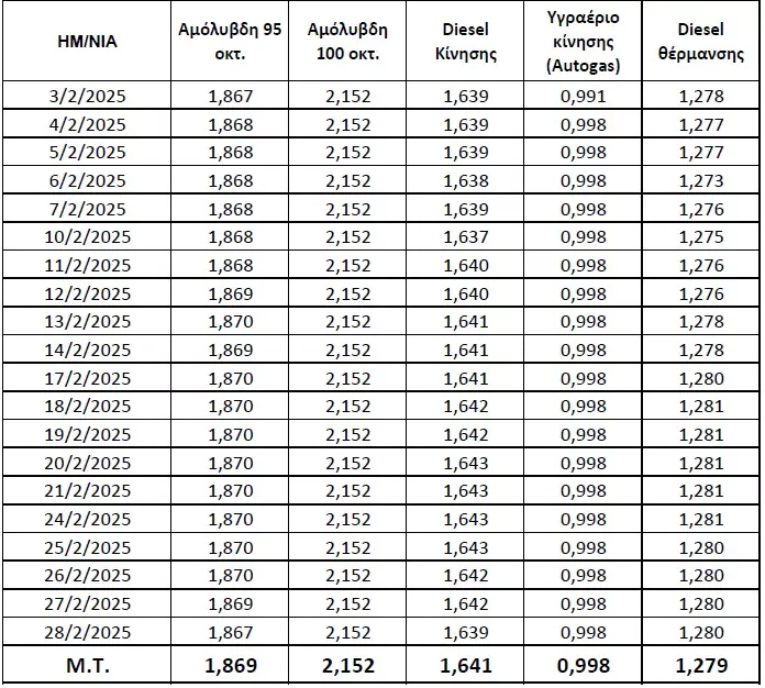Πώς κυμάνθηκαν οι τιμές των καυσίμων σύμφωνα με το μηνιαίο δελτίο πιστοποίησης τιμών καυσίμων για το Φεβρουάριο του 2025, όπως καταρτίστηκε από το Τμήμα Εμπορίου της Διεύθυνσης Βιομηχανίας, Εμπορίου, Παιδείας και Απασχόλησης της Περιφερειακής Ενότητας Γρεβενών.