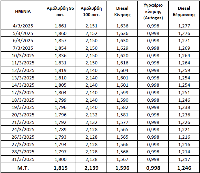 Πώς κυμάνθηκαν οι τιμές των καυσίμων σύμφωνα με το μηνιαίο δελτίο πιστοποίησης τιμών καυσίμων για το Μάρτιο του 2025, όπως καταρτίστηκε από το Τμήμα Εμπορίου της Διεύθυνσης Βιομηχανίας, Εμπορίου, Παιδείας και Απασχόλησης της Περιφερειακής Ενότητας Γρεβενών.
