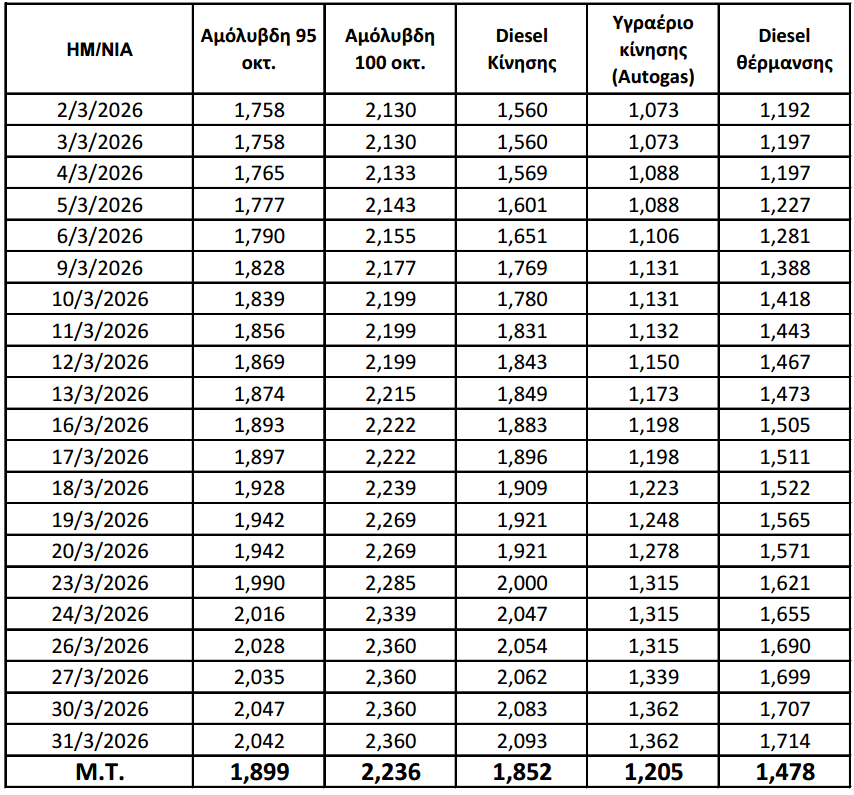 Πώς κυμάνθηκαν οι τιμές των καυσίμων σύμφωνα με το μηνιαίο δελτίο πιστοποίησης τιμών καυσίμων για το Μάρτιο του 2026, όπως καταρτίστηκε από το Τμήμα Εμπορίου της Διεύθυνσης Βιομηχανίας, Εμπορίου, Παιδείας και Απασχόλησης της Περιφερειακής Ενότητας Γρεβενών.