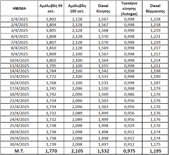 Πώς κυμάνθηκαν οι τιμές των καυσίμων σύμφωνα με το μηνιαίο δελτίο πιστοποίησης τιμών καυσίμων για το Απρίλιο του 2025, όπως καταρτίστηκε από το Τμήμα Εμπορίου της Διεύθυνσης Βιομηχανίας, Εμπορίου, Παιδείας και Απασχόλησης της Περιφερειακής Ενότητας Γρεβενών.