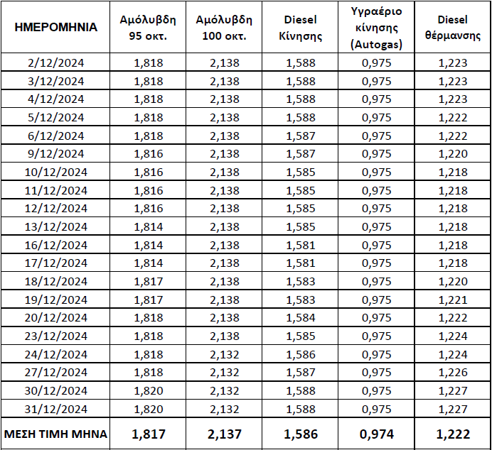 Πώς κυμάνθηκαν οι τιμές των καυσίμων σύμφωνα με το μηνιαίο δελτίο πιστοποίησης τιμών καυσίμων για τον Δεκέμβριο του 2024, όπως καταρτίστηκε από το Τμήμα Εμπορίου της Διεύθυνσης Βιομηχανίας, Εμπορίου, Παιδείας και Απασχόλησης της Περιφερειακής Ενότητας Γρεβενών.